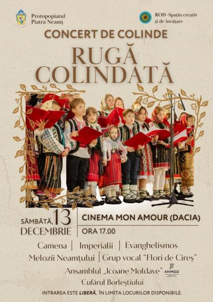 Preasfințitul Părinte Nichifor Botoșăneanul va participa la concertul de colinde organizat de Protopopiatul Piatra Neamț, care va avea loc, începând cu ora 17.00, la Cinema Mon Amour (Dacia) din Piatra Neamț. Programul de colinde va fi susținut de următoarele grupuri și ansambluri: Camena, Imperialii, Evanghelismos, Melozii Neamțului, Grupul vocal „Flori de Cireș”, Ansamblul „Icoane Moldave” și Cufărul Borleștiului. Participarea la eveniment este liberă, în limita locurilor disponibile.